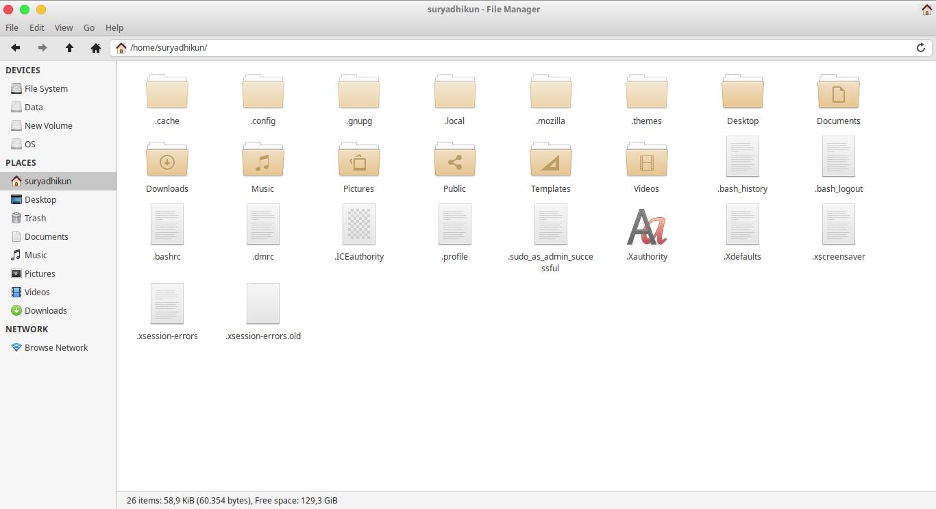 3. Setelah itu, kamu buka direktori “Home”. Di direktori “Home”, kamu tekan tombol CTRL+H pada keyboardmu untuk menampilkan folder atau file yang terhidden.